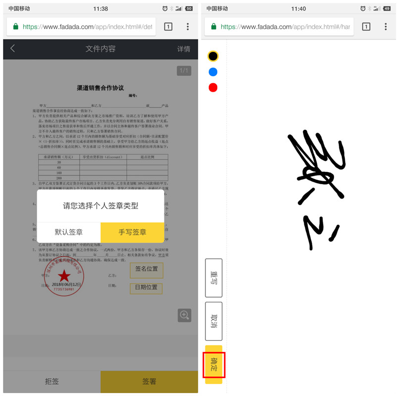 2、开始签署:选择默认签章或现场手写签名进行签署。