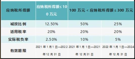 2021年1月1日至2022年12月31日,对小型微利企业年应纳税所得额不超过100万元的部分,减按12.5%计入应纳税所得额,按20%的税率缴纳企业所得税。