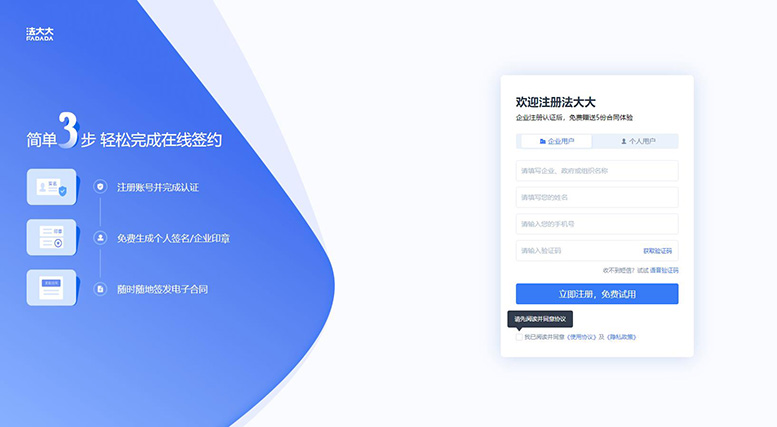 创建一个法大大账号,进入法大大官网,选择企业注册,然后填写注册信息,成功注册一个企业账号。