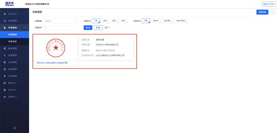 企业认证成功后,法大大会根据工商信息为企业用户在线生成电子章(企业名称章),电子章的名称取自实名认证的企业名称,与实物公章一样具备法律效力。