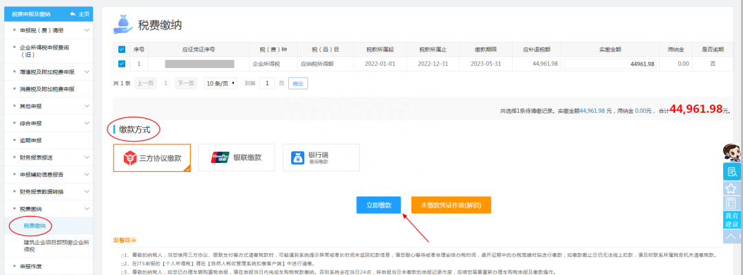 在“申报成功”界面上, 纳税人可以点击“缴款”,即可跳转到缴款界面进行网上扣款。