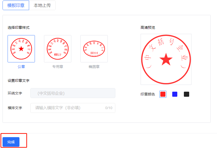 ②自定义选择合同章样式、大小后,在页面左下方点击“完成”即可生成,见下图