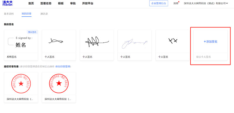 2、完成账号的实名认证,在完成实名认证后法大大系统会为你免费生成电子签名:个人用户会生成电子签名,当然如果是企业用户,对应生成电子印章;